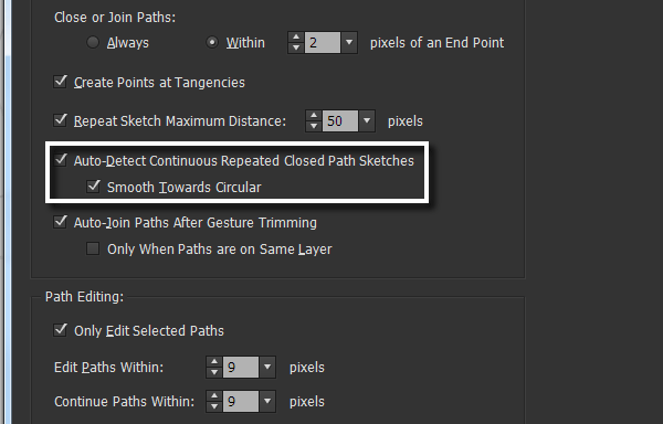 Typically, artists create rounded shape objects by multiple repetition of its shape. DynamicSketch makes drawing circular objects so quick and simple. Open the DynamicSketch Preferences dialog box, and then tick Auto-Detect Continuous Repeated Closed Path Sketch Traces and Smooth Toward Circular.