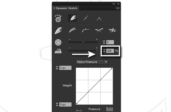 Set 100% for smoothness and Stylus Pressure in the Dynamic Sketch panel.