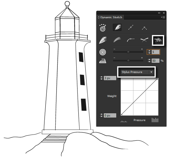 Draw the outline of the lighthouse with variable stroke paths using the DynamicSketch Tool.