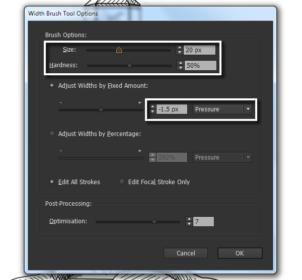 Take the Width Brush Tool, then open the Width Brush Tool Options dialog box by double-clicking on the tool’s icon or on the Return/ Enter key. Set the desired brush size and hardness. You can also change the brush size by using the Left and Right Square brackets. I think that 50% hardness is the best setting for this piece of work. Choose Adjust Width by Fixed Amount, set -1.5 px and also Pressure if you’re using a graphics tablet.