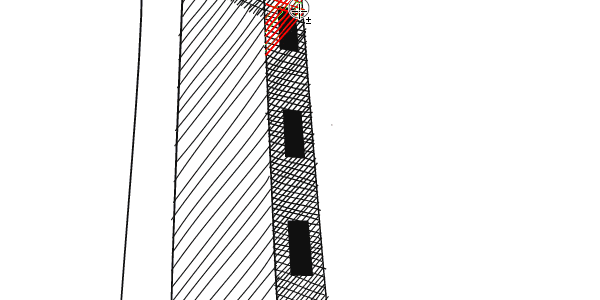 Usually at the edges of an object the shadow becomes less dense due to reflections from the surrounding environment. Let’s reduce the shadow’s density on the right edge of the lighthouse. To do this, select the hatching, and then draw on it from top to bottom using the Width Brush Tool.