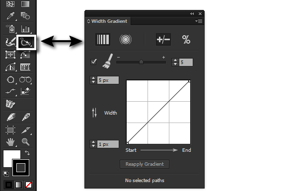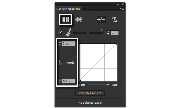 Now we can apply linear and radial gradients to selected paths. The Width Gradient Tool doesn’t change the color like a normal gradient does, but it changes the widths of paths. To see how it works, choose a linear gradient and set the starting and ending width of the paths.
