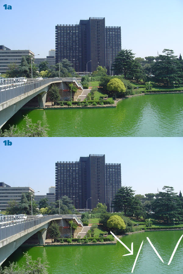 I chose a shot of a lake from the EUR neighborhood in Rome (1a). While the photo itself is nothing special, the composition has potential: the shoreline is interesting, there’s a curved bridge coming in from the left, a bunch of buildings in the middle, a couple of low rises on the left and trees on the right. When you analyze the photo, take notice of any element, not just the physical ones: there are triangular reflections on the water, we’ll definitely use those! (1b).