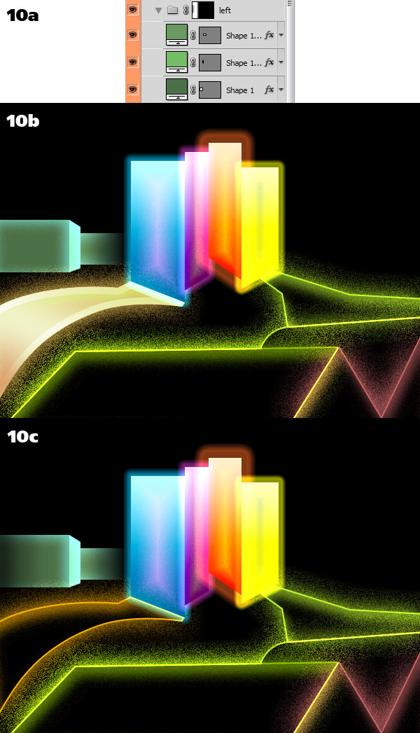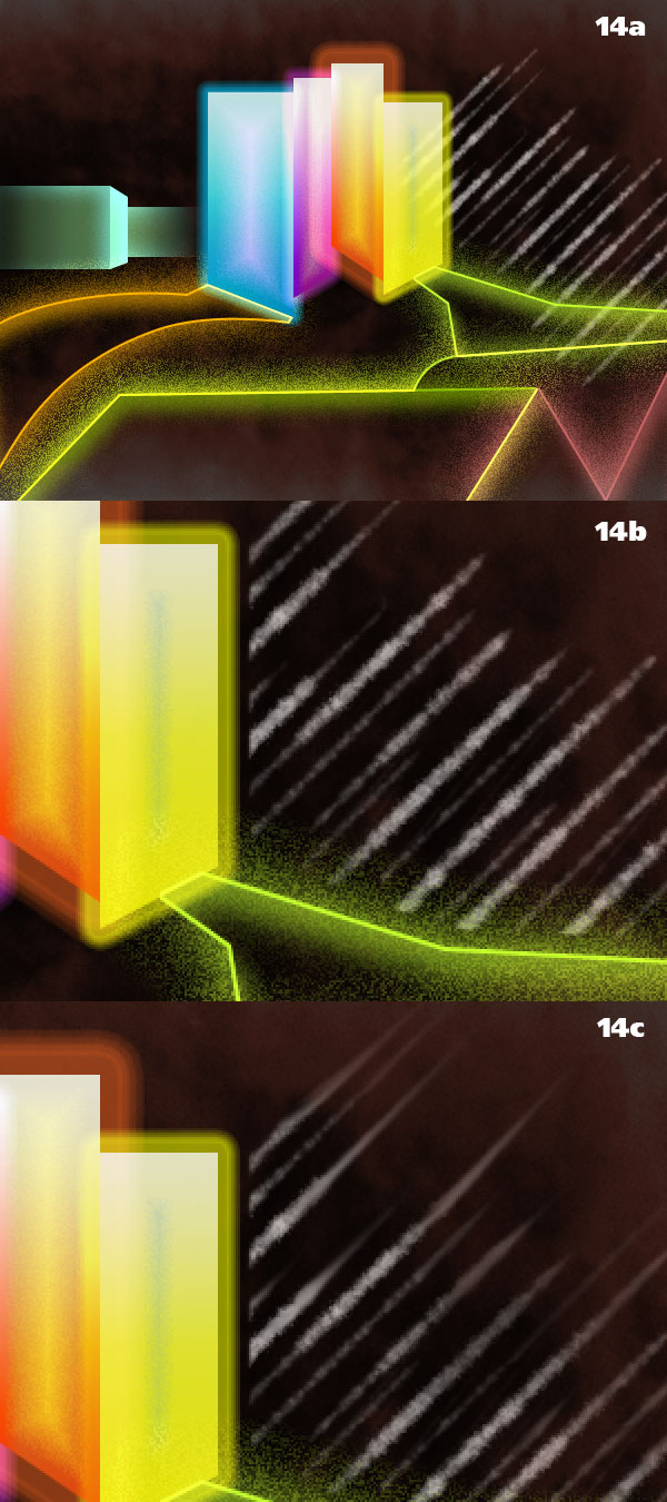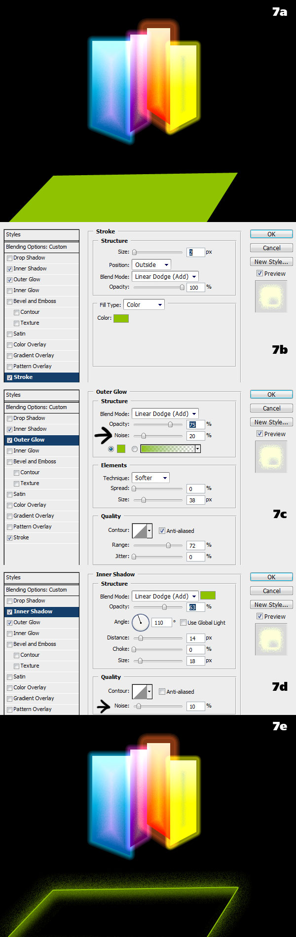 For the roofs and the ramp we are going for a “neon and space dust” look. It’s just a matter of using layer styles in a slightly unorthodox manner to achieve interesting results. Take the first roof (7a) and turn down the Fill to 0%, effectively making it disappear: only the layer styles will be visible. Apply a Stroke and make it bright by choosing the Linear Dodge blending mode (7b). This is neon enough. The space dust effect is accomplished by turning on noise for both Outer Glow (7c) and Inner Shadow (7d). See? (7e).