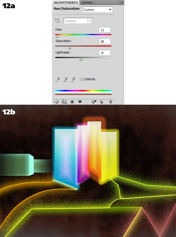 You can color the texture by adding an Adjustment Layer to it. Check the Colorize option and move the sliders around until you find a suitable hue (12a). I chose a faint red tint, taking a hint from the triangular shapes at the bottom of the image (12b). This might be a secondary space dust made of finer particles that reflect the glow form the light objects. Always have a story to go with your illustrations!