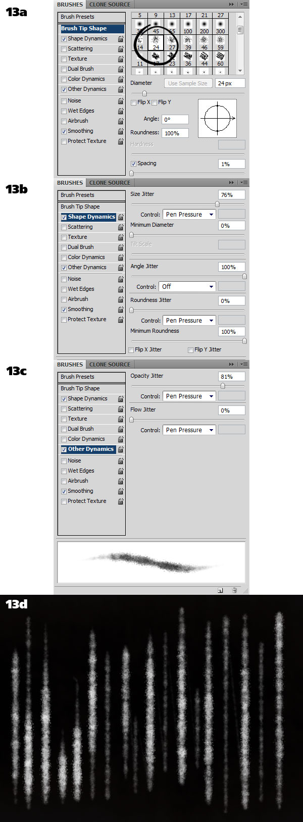 We have to take care of the glaring hole on the right. Let’s put some slanted billows of smoke there. Select the Brush Tool (B) and enter the Brushes window (F5). Pick a textured preset (13a). Turn on both Size Jitter (13b) and Opacity Jitter (13c). You can control the values with a tablet (Pen Pressure setting) which I recommend. Tablets are not cheap but they are indispensable. Paint vertical lines in white on a new layer, varying their length, thickness and opacity (13d).