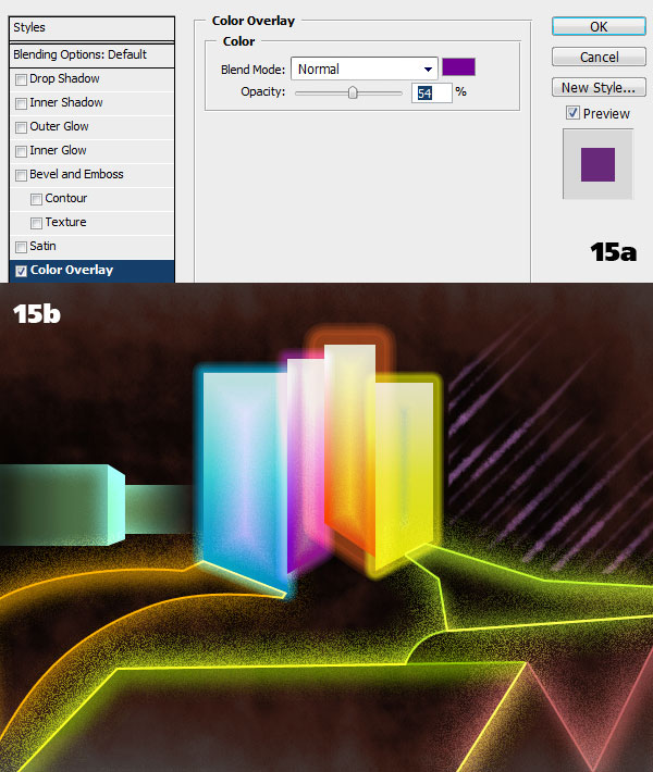 The final step is to color the smoke. Add a Color Overlay style to the layer (15a). Choose the color you want. I picked purple because it contrasts nicely with the bright yellow of the objects surrounding the smoke and it recalls the thin purple building in the main cluster (15b). You’re done!