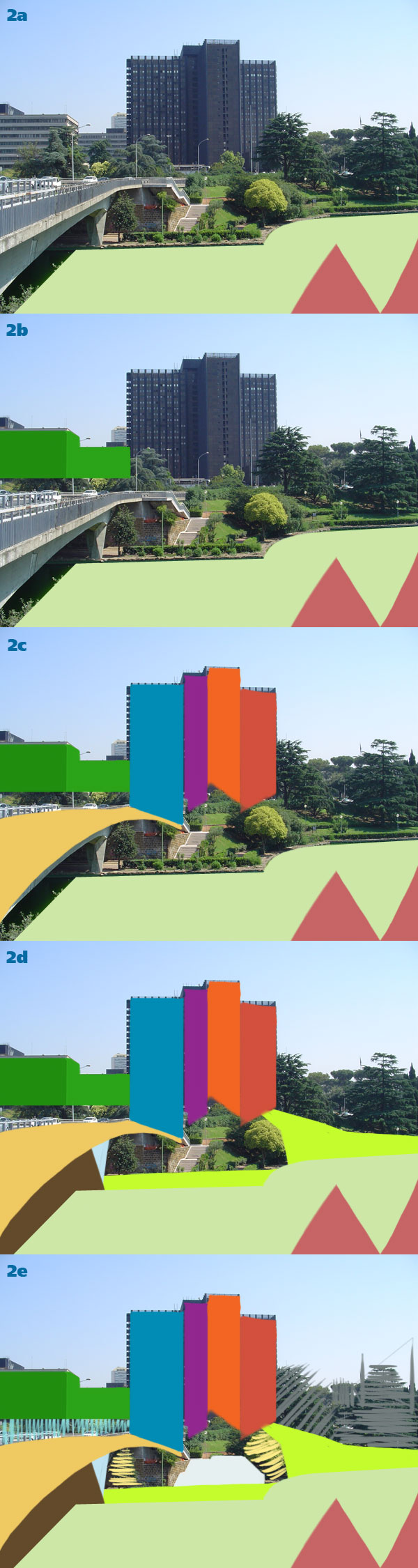 Let’s examine the final composition: a couple of low buildings seen in perspective on the left; a curved bridge coming in from the bottom left corner; a couple of roofs and a ramp leading up to four tall buildings placed roughly in the middle, strongly pulling upwards; a hole at the far right of the image, to be filled with organic shapes. This abstract landscape is the result of interpreting a plain photograph (6a).