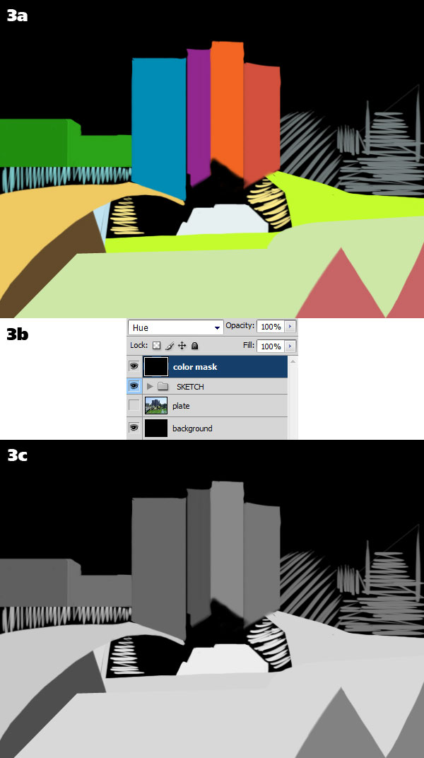 Now we can get rid of the photograph and put a black background behind the sketch (3a). Before analyzing the composition, though, we need to eliminate the colors because they might distract us. To do that, create a black layer above the sketch and set it to either Hue or Saturation mode (3b). Now the colors are gone and we can evaluate the composition better (3c).