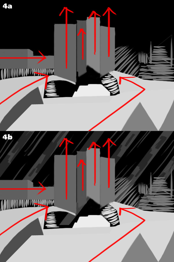 I’ve drawn arrows to show the ideal paths formed by our shapes. It’s a good idea to have the composition lead the eye towards the focus point, in this case the center buildings (4a). As you can see we have three groups of shapes that pull towards the tall buildings and these in turn point upwards. We need to add a contrasting direction: that’s what the background and the empty spot at the far right are for. We’ll probably create a background pattern made of slanted stripes and we’ll put irregular shapes next to the rigid buildings (4b).