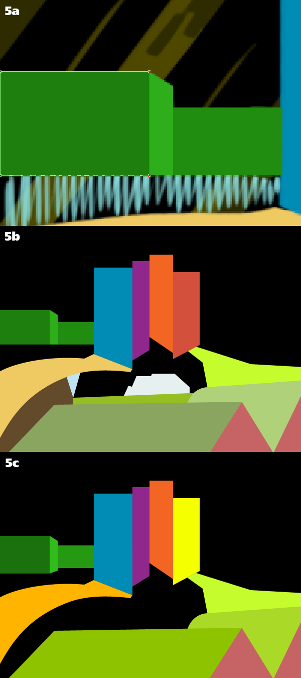 Start building shapes using paths, going directly over the sketch. For now keep the original colors (5a). When you’ve traced everything (5b) do all the tweaking you want, moving points, changing colors to group shapes chromatically and, most importantly, eliminating the smallest shapes that only add confusion to the composition (5c).