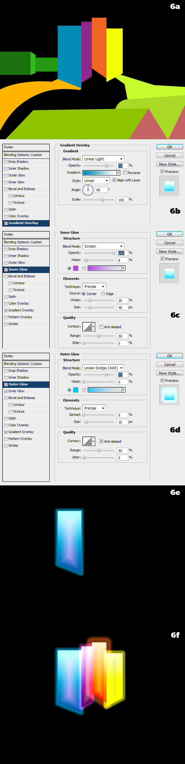 We will start shading the tall buildings. Apply a bunch of layer styles to the shape layers: everything is editable and scalable at any time. A gradient overlay to make the top of the buildings lighter (6b), an Inner Glow with noise to create texture (6c), Outer Glow (6d). Since these buildings are the focus of the image, it makes sense to give them a bright appearance (6e). Apply the same layer style to the other buildings, changing the colors appropriately (6f).