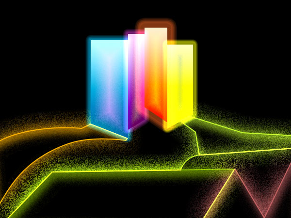 Apply this layer style to the other roofs and ramps, each time adjusting the colors to match those of the parent shape. Tweak values like the amount of noise and the size of the glows to add variation and to suggest perspective: farther objects have less noise.