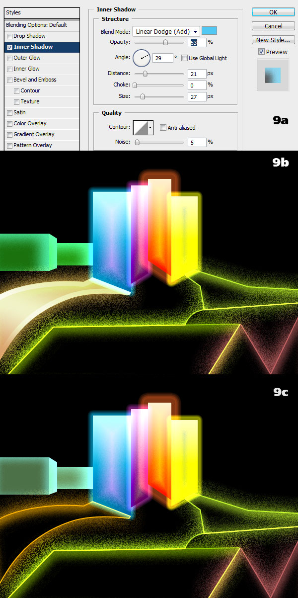 The green buildings on the left receive a strong blue glow from the adjacent building so add it with a noisy Inner Shadow (9a). Use the Size and Distance values to tweak the effect to your liking (9b). Since these are secondary elements I’ve decided to desaturate them from green to a pale water green (9c). Remember that everything you see on the screen is vector shapes and layer styles so you can change shapes, colors, effects and image size at any time without losing sharpness. There are pixel limits to layer styles, though, keep that in mind.