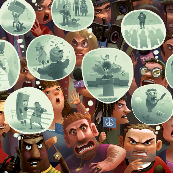 Also, I’ve begun to develop some personal pieces, with a much more painterly style. I’m trying to develop a style that moves away from caricature but is also more dramatic. With a theme of street demonstrations and police repression…but is still a work in process.