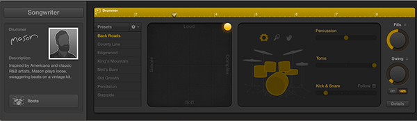 Using the Drummer Track Controls gives you effortless variations to your loops. A simple parameter change to the drum parts being played or a change in the complexity of the playing style will quickly give you a new version of your loop or a completely different loop depending on the degree of parameter change.