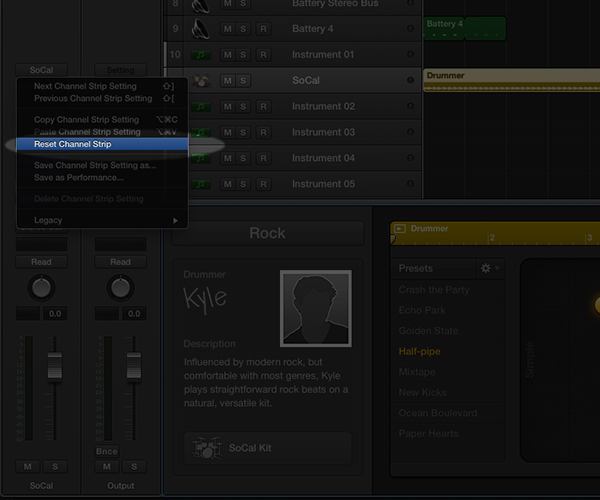 You can change the drum preset to try out different drum grooves, but changing virtual drummer will cause the Channel Strip to be reset. I don’t think there’s any getting around this because changing the Drummer also changes the drum kit and the Audio FX for that kit.