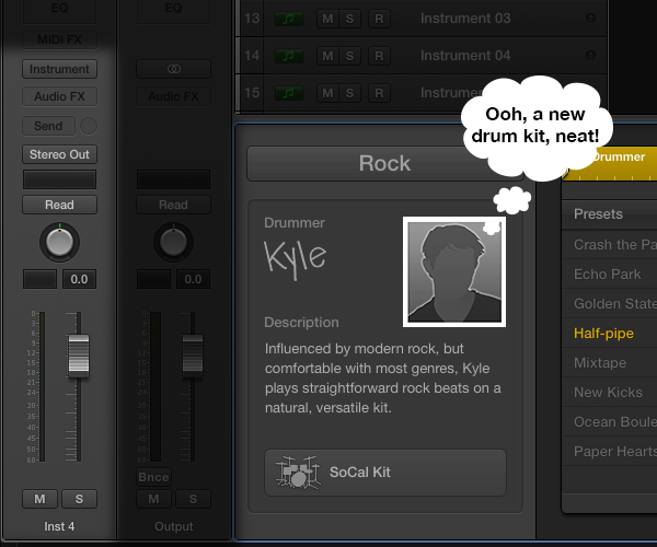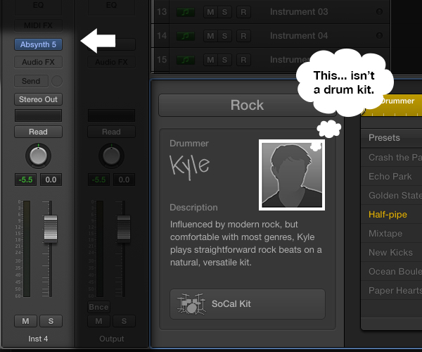 In true Apple fashion, Drummer inside of Logic Pro X is an almost seamless collaboration of virtual “hardware” and scripting software. When you create a new Drummer Track by either going to Track > New Drummer Track or by selecting the New Tracks icon and selecting Drummer, Logic Pro X will create a Drummer Track and load a Channel Strip Setting with the new Drum Kit Designer among other effects . You can think of the Drum Kit Designer as the “hardware” and the Drummer Track as the “software” that is being used in tandem with the “hardware”.