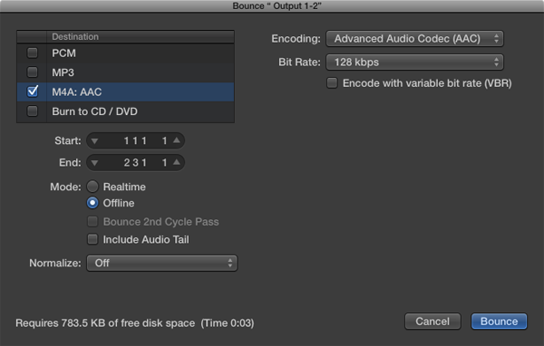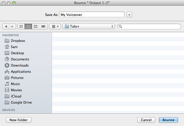The final step is to click the Bounce button, and select the destination in which to save your voiceover.