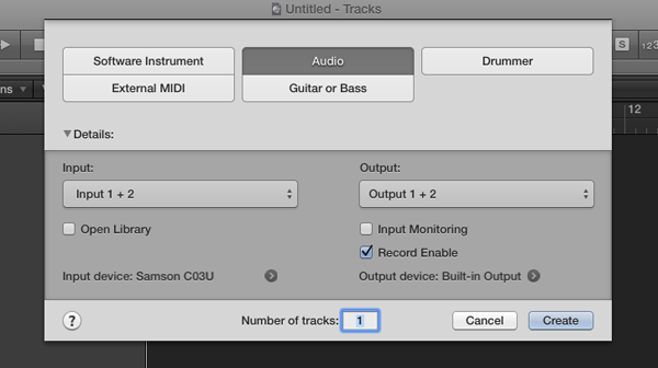 Select Audio from the track types, and set your input and outputs accordingly. Then, click the Create button.