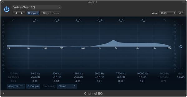We’re now going to use the Channel EQ effect, which can be activated in the Channel Settings panel, just like the Speech Enhancer effect. Once enabled, select the Voice-Over EQ preset from the drop-down menu at the top of the popup window.