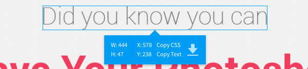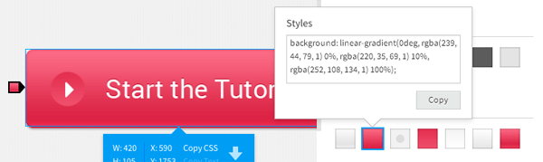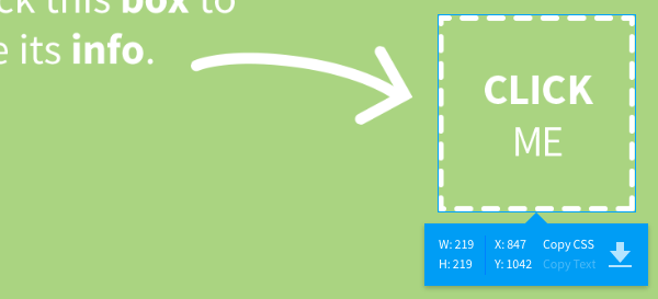 Alternatively, with the element selected, a blue call out will appear, on which you can click the Copy CSS link to grab all the code directly: