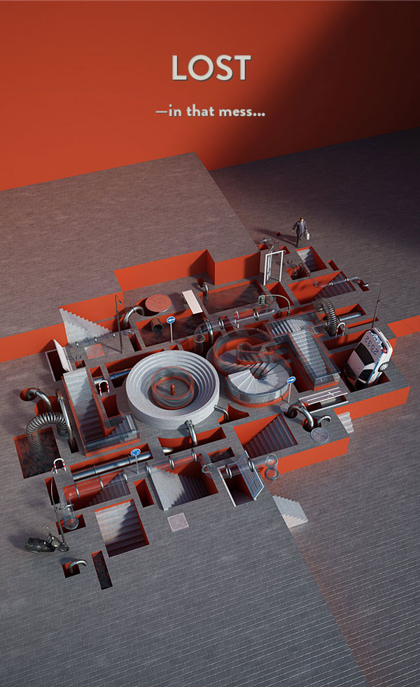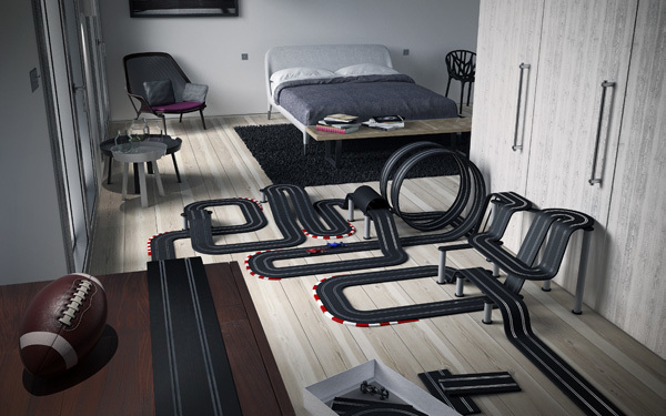 Can you tell us a bit about your “ENJOY – Racing Car Track” piece? How did this idea develop? Did you have a similar toy racecar track when you were young? One thing that I noticed about this piece is that it is set in a modern apartment and not a child’s playroom. Why did you choose this type of environment to set your scene? Is the target audience for this ad some one a bit older?
