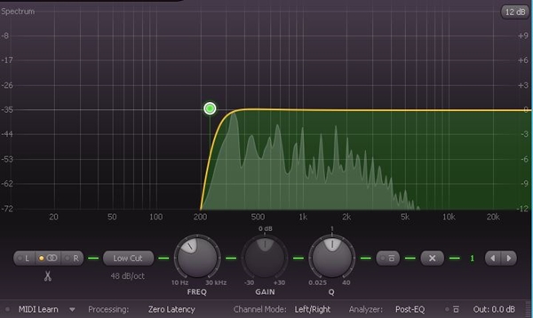 Note that while the difference isn’t huge on one track, this is a cumulative effect. The more you do it across your high-end instruments, the more room your low-end instruments (especially percussion) will have to shine.