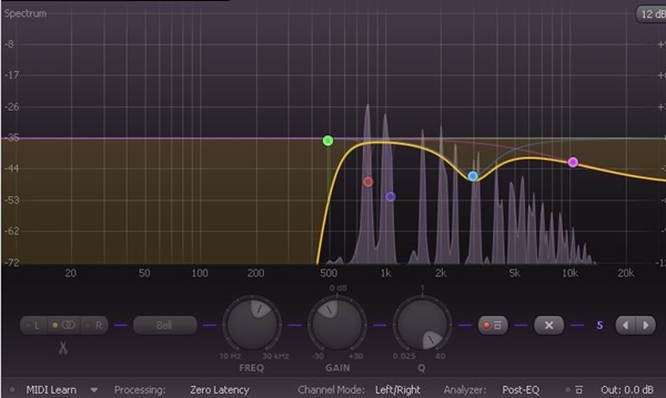 I also like to roll off some of the very high-end frequencies, as when you have a lot of instruments playing, these build up too. Not so much that it becomes muffled, but just a touch.