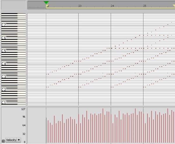 To illustrate how important velocities are, here is a different short piece just using an ascending scale. The first version is without velocity changing (everything playing at the highest velocity) and the second version is with velocity changing.