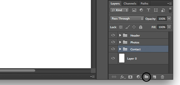 Sticking to Photoshop etiquette we’ll keep things organized and easy to navigate and edit. Let’s create three layer groups named Header, Photos and Contact. To create groups go to Layer > New > Group… and give each one a title as mentioned. For quick creation of a group just click the icon.