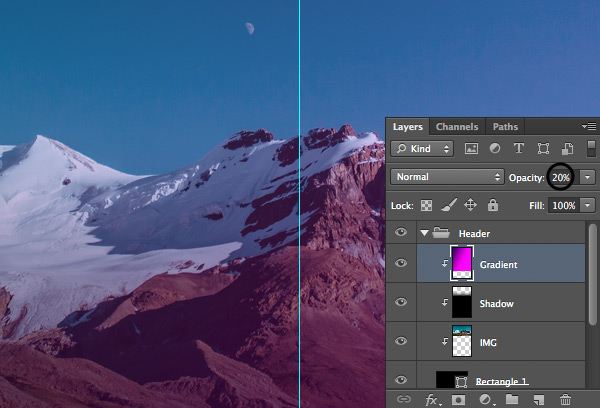 Let’s add some more colors to our header to make it even more awesome. Create a new layer, name it Gradient and once again pick the Gradient Tool (G). After that set the gradient colors to go from purple #37056b to pink #ff01fc (or any other colors you want) and drag from the top left corner of the image to the right bottom corner. Finally, reduce the gradient layer’s Opacity to 20%.