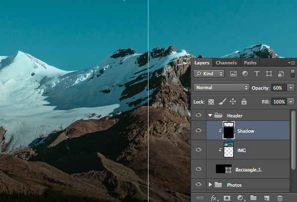 Let’s make some adjustments to our image so it looks more vivid and memorable. Create a new layer, call it Shadow and create a Clipping Mask as we did for the mountains image. Then pick the Gradient Tool (G) and set gradient colors to go from black #000000 to transparent, holding down the Shift key drag from the bottom of the placed image to around middle of it. Finally reduce the gradient layer’s Opacity to 60%.