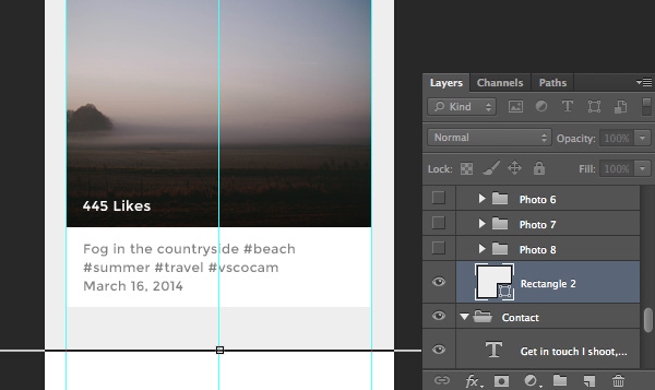 Now pick the Rectangle Tool (U) and draw a white rectangle shape below the photo. Then grab the Horizontal Type Tool (T) and write a short photo description you’d use on Instagram, including hashtags and also a posting date on a new line. The font I’ve used for this tutorial is Montserrat 12px size in grey #808080.