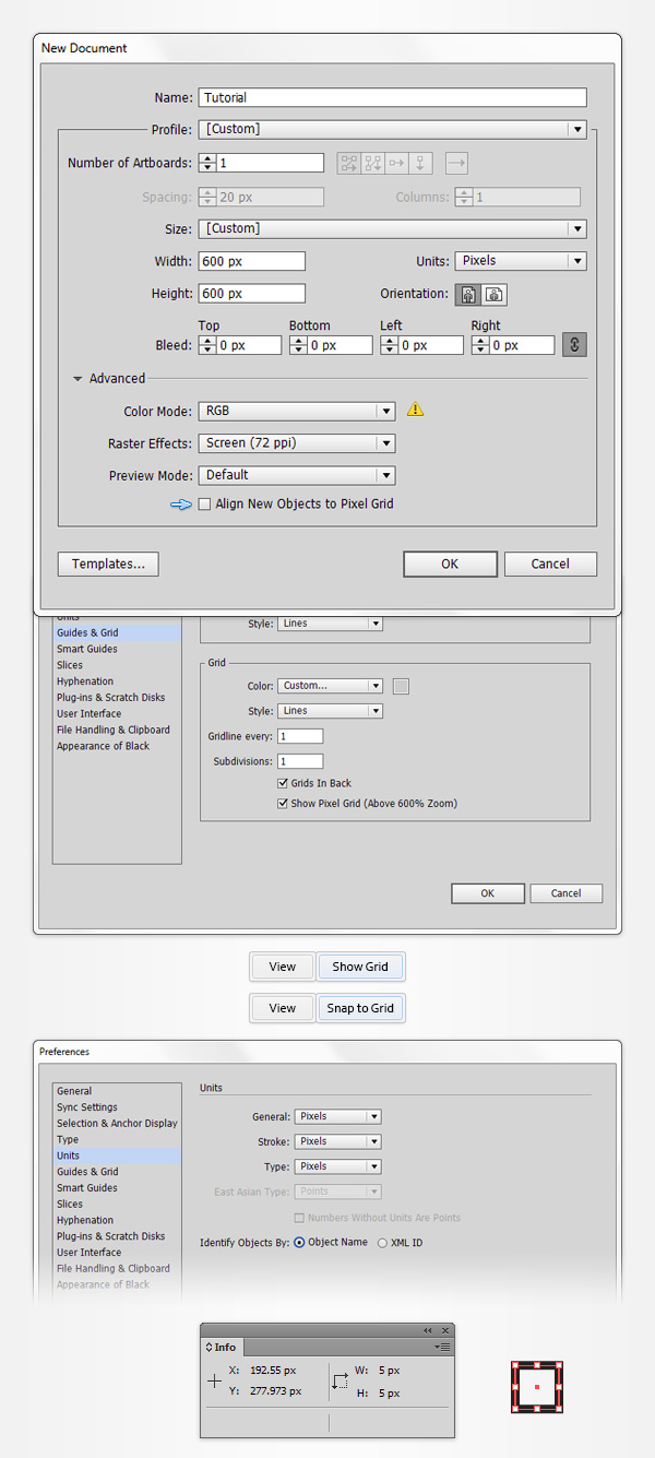 Enable the Grid (View > Show Grid) and the Snap to Grid (View > Snap to Grid). You will need a grid every 1px, so simply go to Edit > Preferences > Guides > Grid, enter 1 in the Gridline every box and 1 in the Subdivisions box. Try not to get discouraged by all that grid, it will ease your work and keep in mind that you can easily enable or disable it using the Control-“ keyboard shortcut. You should also open the Info panel (Window > Info) for a live preview with the size and position of your shapes. Do not forget to set the unit of measurement to pixels from Edit > Preferences > Units > General. All these options will significantly increase your work speed.