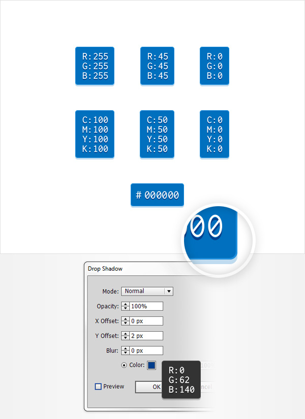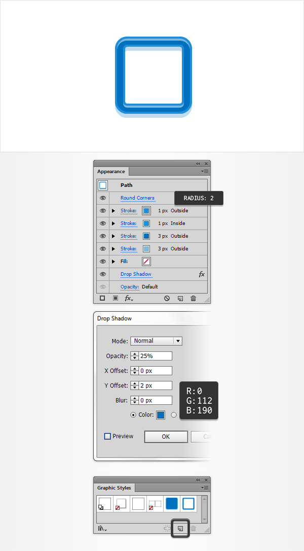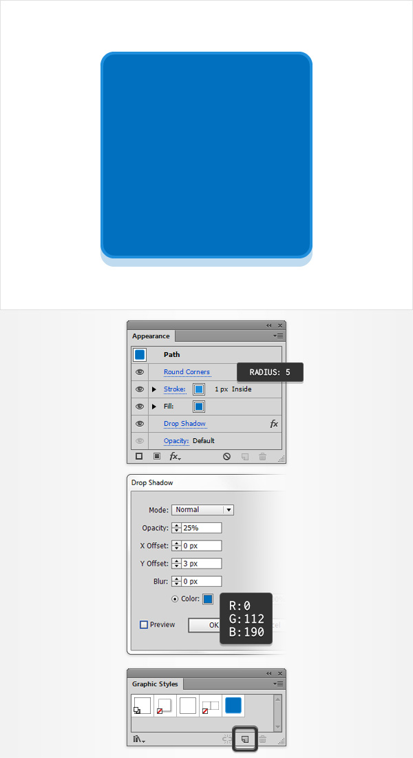 Reselect your blue rectangle, focus on the Appearance panel, make sure that the entire path is selected (simply click on that “Path” piece of text from the top of the Appearance panel) and go to Effect > Stylize > Rounded Corners. Enter a 5px Radius, click OK and go to Effect > Stylize > Drop Shadow. Enter the properties shown in the following image and click OK. Make sure that your blue rectangle is still selected, open the Graphic Styles panel (Window > Graphic Styles) and simply click the New Graphic Style button to save a new graphic style. Double-click on your graphic style and simply rename it “blue“.