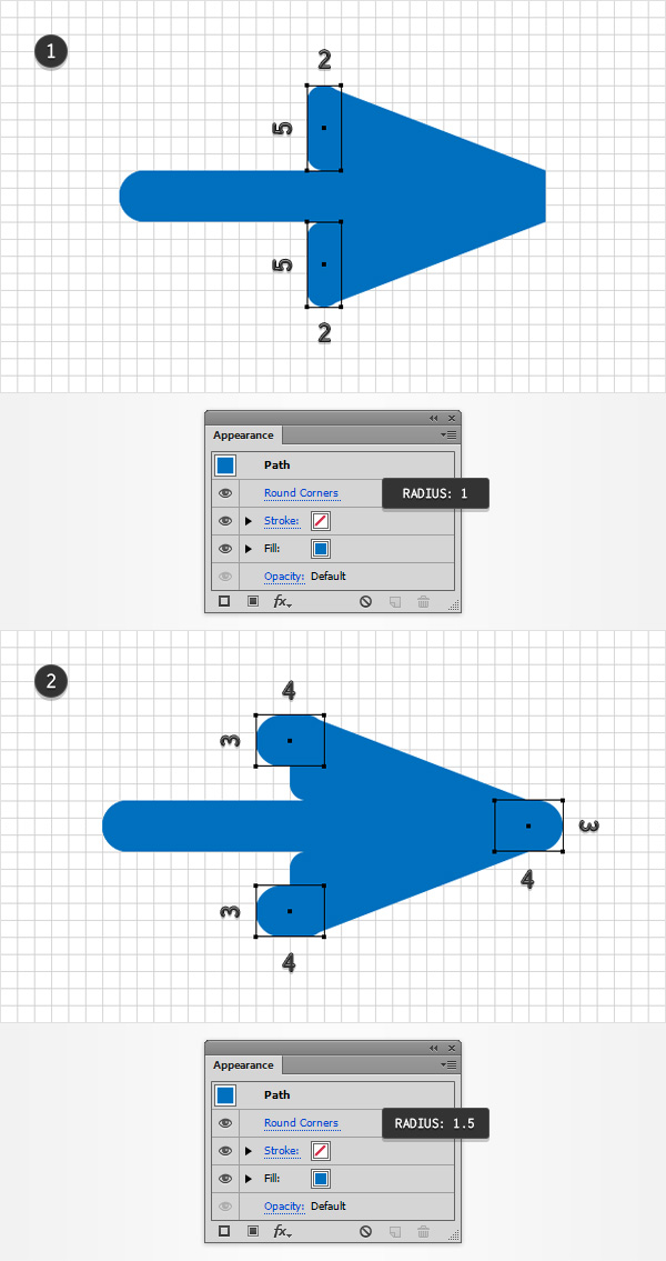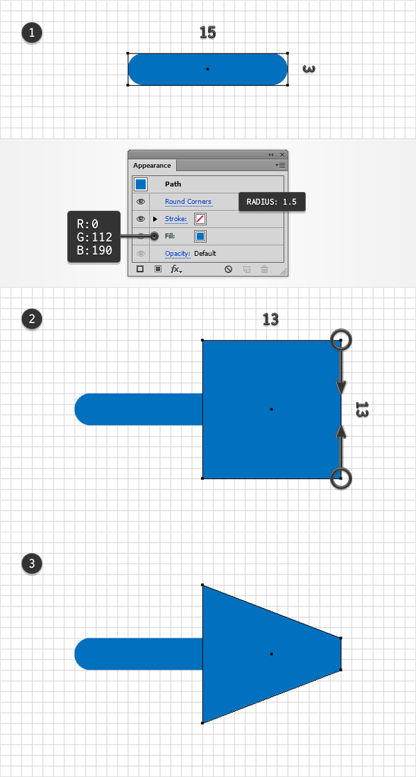Using the Rectangle Tool (M), create a 15 x 3px shape, fill it with your “mainColor” and go to Effect > Stylize > Rounded Corners. Enter a 1.5px Radius, click OK and go to Object > Expand Appearance. Make sure that the Rectangle Tool (M) is still active, create a 13px square and place it exactly as shown in the second image. Focus on the right side of this new shape and switch to the Direct Selection Tool (A). Select the top anchor point and drag it 5px down then select the bottom anchor point and drag it 5px up.