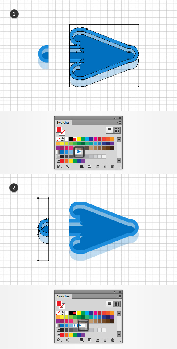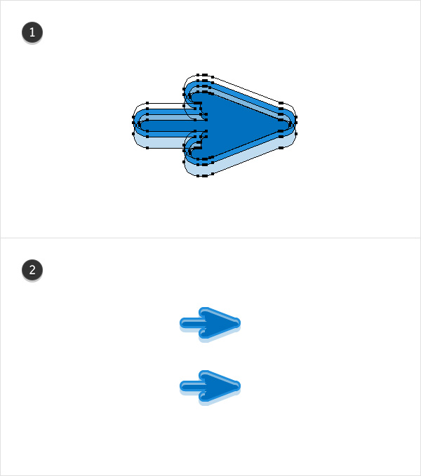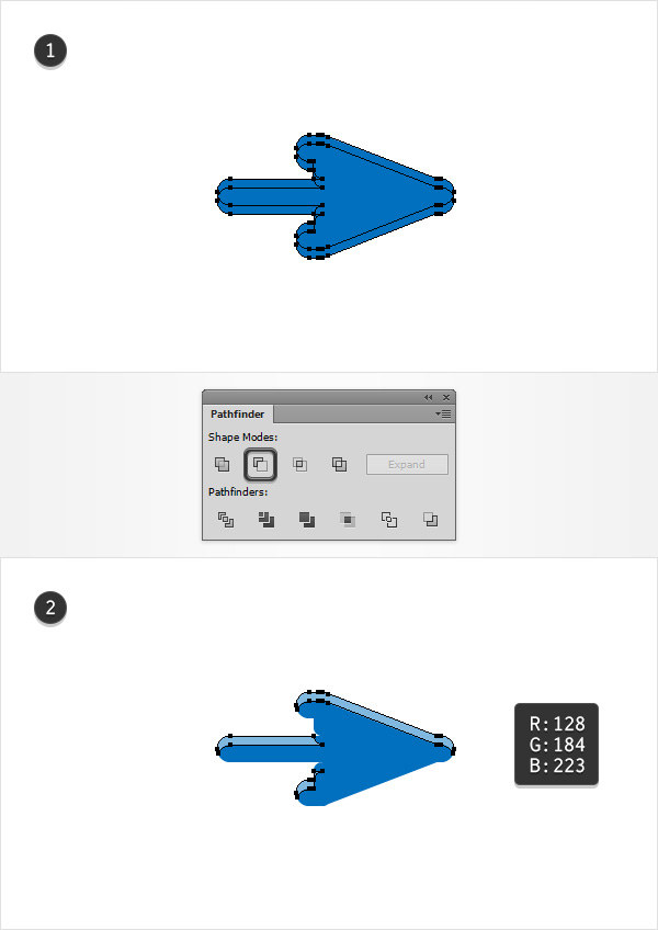 Reselect your blue arrow shape and make two copies in front (Control-C > Control-F > Control-F). Select the top copy and move it 1px down using the down arrow button from your keyboard. Reselect both copies made in this step and click the Minus Front button from the Pathfinder panel. Make sure that the resulting group of shapes is selected and simply hit Control-8 to turn it into a simple Compound Path. Select it and set “colorTwo” as the fill color.