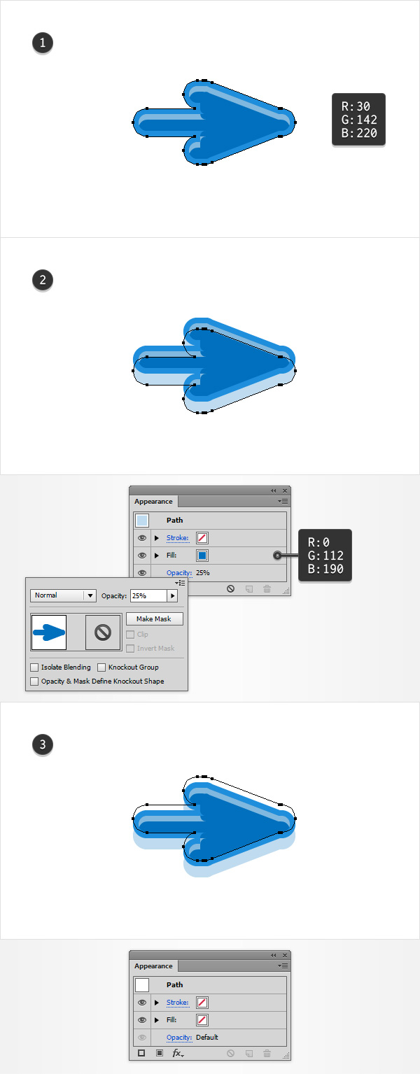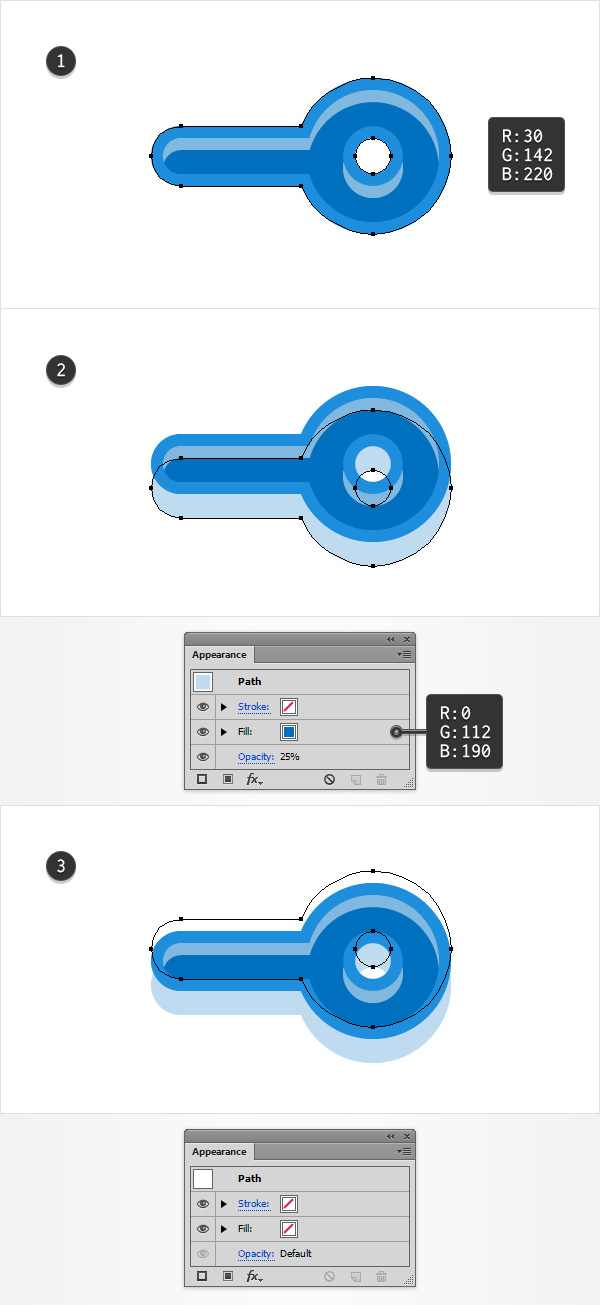 Select the resulting shape and replace the existing fill color with “colorOne“. Make sure that the shape made in this step is still selected and make a copy in back (Control-C > Control-B). Select this copy, move it 2px down and focus on the Appearance panel. Replace the existing fill color with “mainColor“, lower its Opacity to 25% and things should look like in the second image.
