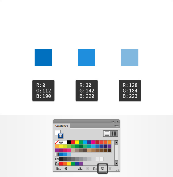 Focus on the Swatches panel (Window > Swatches), click the New Swatch button (pointed in the following image), enter the color code mentioned a few moments ago, name it “mainColor” and click OK. Next, you need to add to variations of your main color. Return to the Swatches panel and simply save the R=30 G=142 B=220 (name it “colorOne“) and the R=128 G=184 B=223 (name it “colorTwo“) colors.