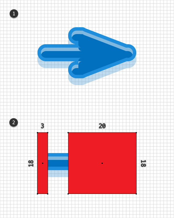 Focus on your other arrow group. Using the Rectangle Tool (M), create a 3 x 18px shape and a 20 x 18px shape and place them as shown in the second image. Make sure that both rectangles are selected, set the fill color at red and turn them into a simple Compound Path (Control-8).