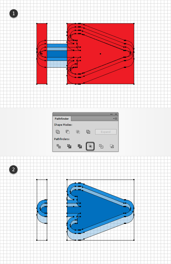 Reselect your red rectangle along with the pointer group and hit the Crop button from the Pathfinder panel. Turn the resulting group of shapes into a pattern and name it “pointeEnd“.