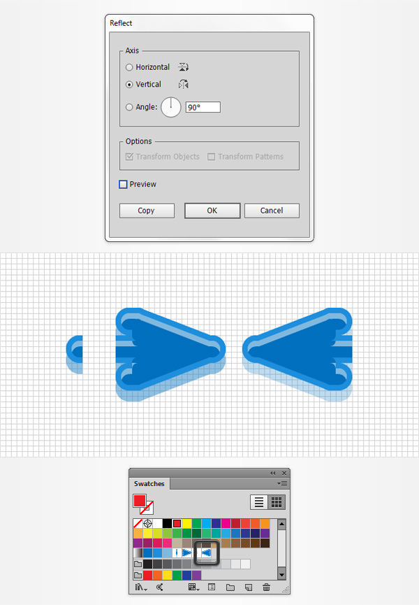 Reselect the group that makes up the arrow and simply go to Object > Transform > Reflect. Check the Vertical box and click the Copy button. Select the resulting group, turn it into a new pattern and name it “startTileArrow“.
