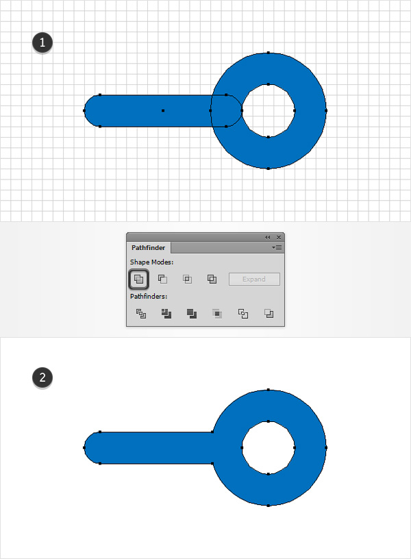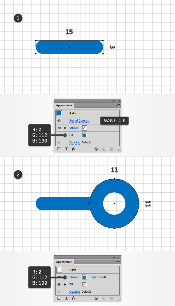 Using the Rectangle Tool (M), create a 15 x 3px shape, fill it with your “mainColor” and go to Effect > Stylize > Rounded Corners. Enter a 1.5px Radius, click OK and go to Object > Expand Appearance. Switch to the Ellipse Tool (L), create an 11px circle, place it as shown in the first image and make sure that it stays selected.