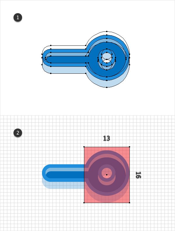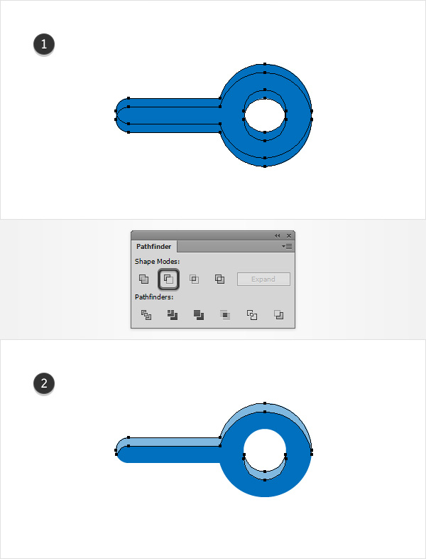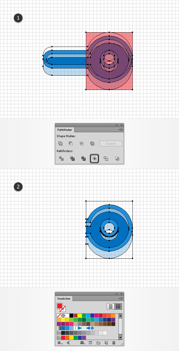 Reselect both copies made in this step and click the Minus Front button from the Pathfinder panel. Make sure that the resulting group of shapes is selected, turn it into a Compound Path (Control-8) and set “colorTwo” as the fill color.
