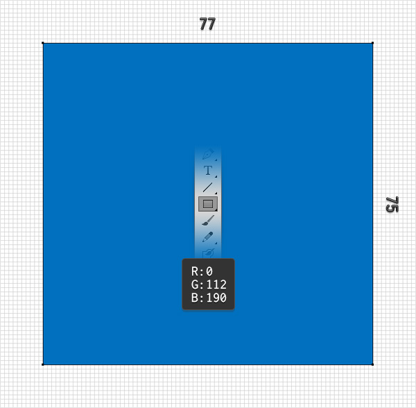 Pick the Rectangle Tool (M) and focus on your Toolbar. Remove the color from the stroke then set your “mainColor” for the fill. Move to your artboard and simply create a 77 x 75px rectangle, the Snap to Grid should ease your work.