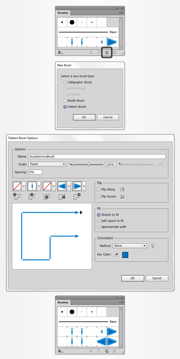 Return to the Brushes panel (Window > Brushes), click the New Brush button, check the Pattern Brush box and click OK. Enter “doubleArrowBrush” in the Name box then focus on to the Tile boxes. Open the Side Tile window and add your “sideTile” pattern, open the Start Tile and add your “startTileArrow” pattern then open the End Tile and add your “endTileArrow” pattern. Once you’re done, click the  OK button and you should find your new pattern brush inside the Brushes panel.