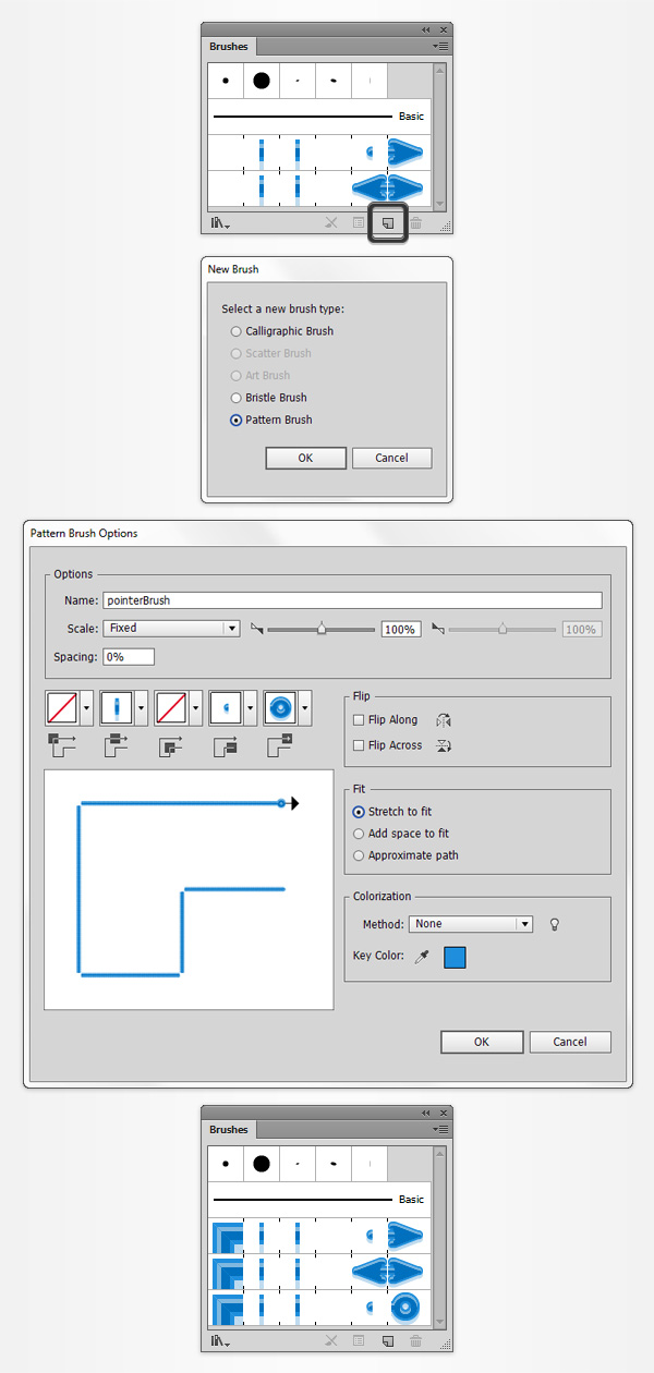 Return to the Brushes panel (Window > Brushes), click the New Brush button, check the Pattern Brush box and click OK. Enter “pointerBrush” in the Name box then focus on to the Tile boxes. Open the Side Tile window and add your “sideTile” pattern, open the Start Tile and add your “roundEnd” pattern then open the End Tile and add your “pointerEnd” pattern. Once you’re done, click the  OK button and you should find your new pattern brush inside the Brushes panel.