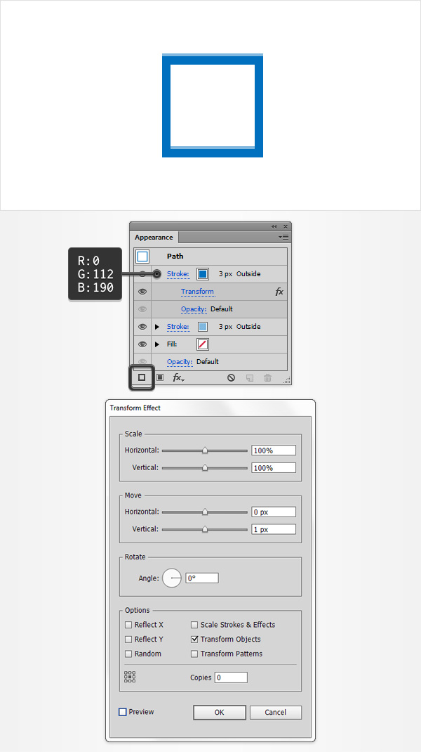Make sure that your square is still selected, focus on the Appearance panel and add a second stroke using the Add New Stroke button. Select the new stroke, replace the existing color with “mainColor” and go to Effect > Distort & Transform > Transform. Focus on the Move section, drag the Vertical slider at 1px and click OK.