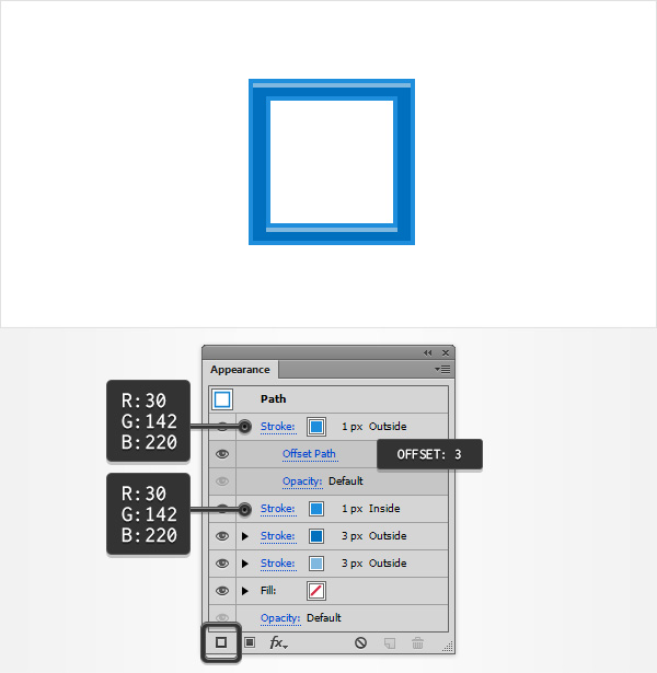 Make sure that your square is still selected, focus on the Appearance panel and add another two strokes using that same Add New Stroke button. Focus on these new strokes and select the bottom one. Replace the existing color with “colorOne“, decrease its Weight to 1px and check the Align Stroke to Inside button. Select the other stroke added in this step, replace the existing color with “colorOne“, decrease its Weight to 1px, make sure that Align Stroke to Outside button is checked and go to Effect > Path > Offset Path. Enter a 3px Offset and click OK.
